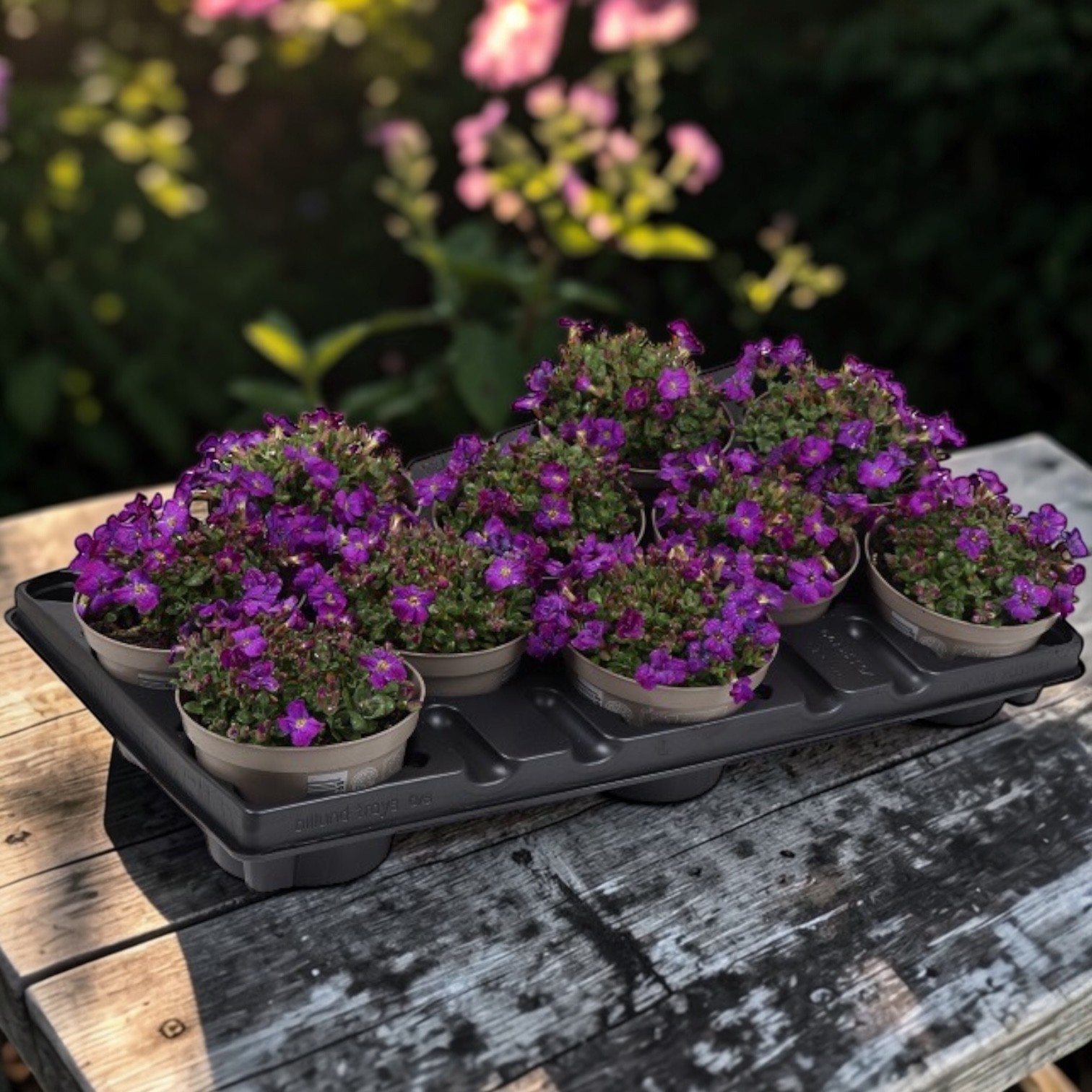 Aubrieta, kendt på dansk som blåpude. Vi har flere forskellige sorter, man langt størstedelen af vores produktion på Gartneriet 7eren er af sorten Kitte, som har store blå/violette blomster. Blåpuder er ideele til beplantning i bede og særligt med dens evne til at tåle tørke, også i stensætninger. Den tiltrækker mange bier og insekter. De produceres i 12 cm potter.