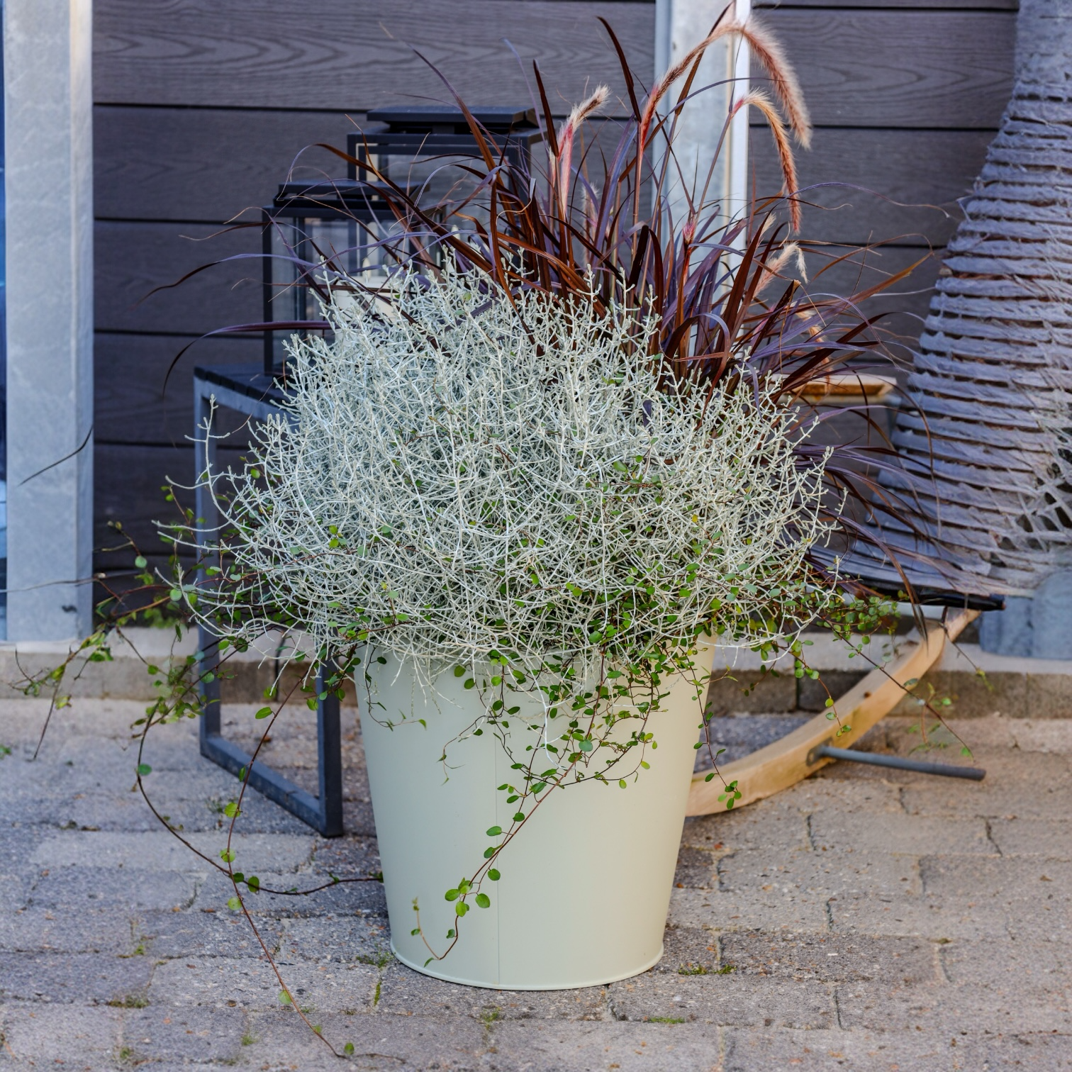 Vi producerer en sammenplantning af Muehlenbeckia og Calocephalus, som vi har valgt at benævne MyCa.