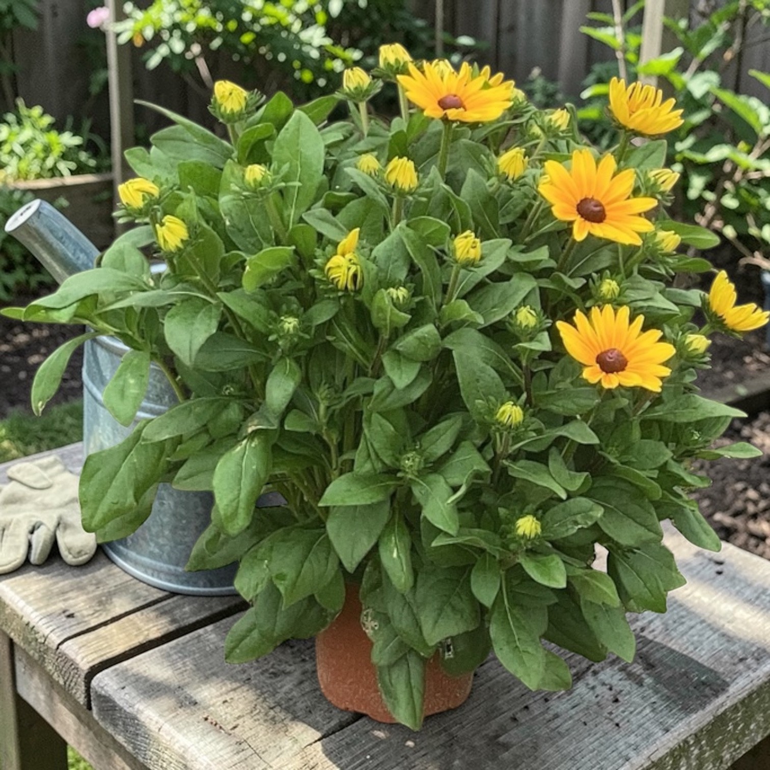 Sunbeckia er en forbedret version af den oprindelige Rudbeckia. På dansk kendt som Solhat.